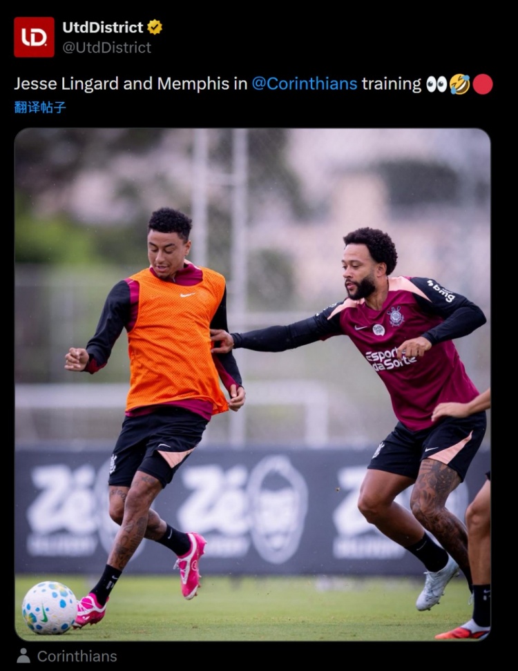 林加德和德佩曾在曼联共事,两人目前都效力于巴西俱乐部科林蒂安,UtdDistrict社媒晒出他们在科林蒂安一起训练的照片。